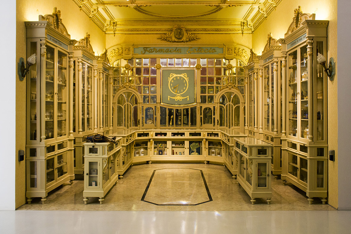 Em frente à farmácia de um palácio, do século XIX, que há décadas viajou de um antiquário de Damasco para Londres e agora brilha no Porto – onde está a salvo da destruição de património que vem acontecendo no Médio Oriente, assinala, gratificado, João Neto – está montada a antiga Farmácia Estácio. Excelente exemplo de uma época, com mobiliário da década de 20 do século passado, onde falta – pena – a balança falante, famosa em toda a região e que duz-se que confundiu Vasco Santana com um duo de pessoas a tentarem pesar-se em simultâneo.